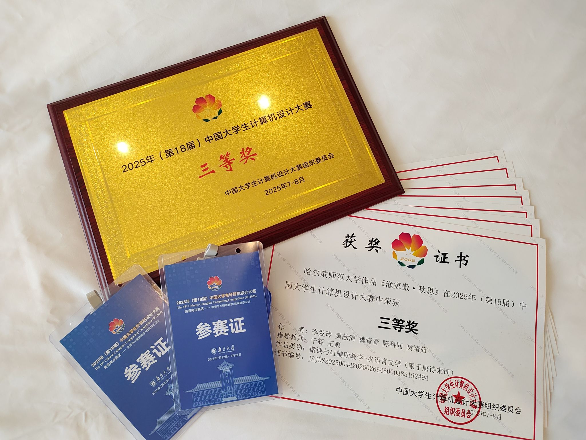 (贲靖茹/文)近日,2025年(第18届)中国大学生计算机设计大赛全国决赛在南京大学圆满落幕。来自全国高校的896件参赛作品同台竞技,我院跨学科团队凭借作品《渔家傲·秋思》在“微课与AI辅助教学”赛道中脱颖而出,荣获三等奖,展现了计算机技术与教育教学深度融合的创新成果。